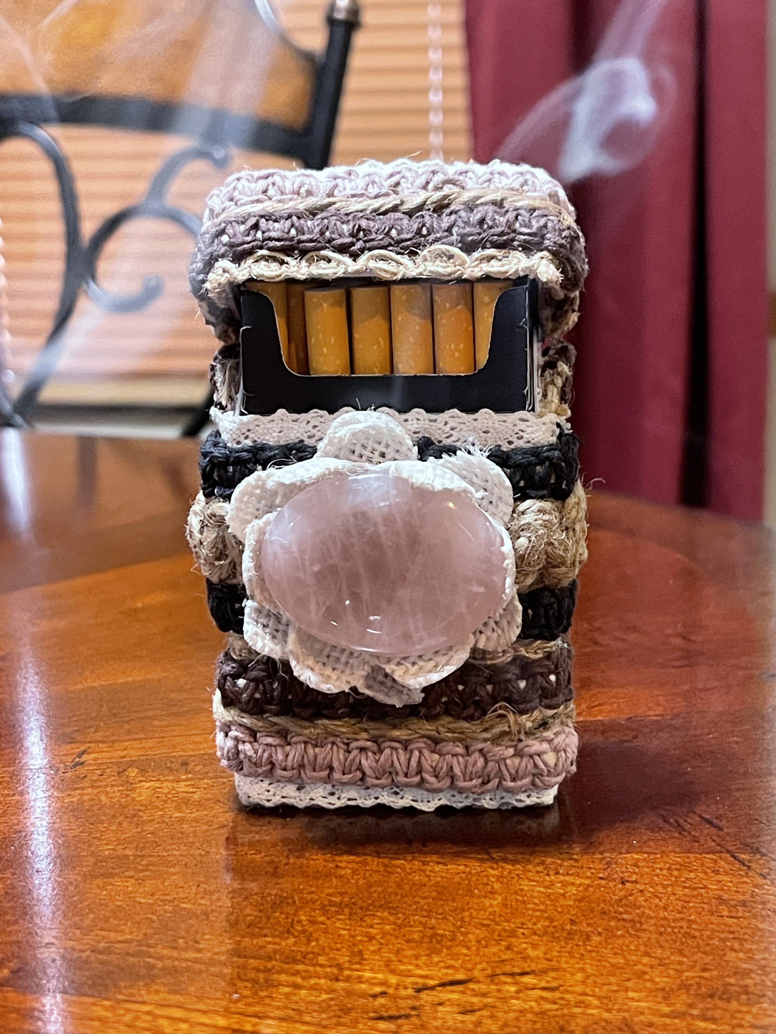 Made using hemp, cotton, jute, and natural gem stones. A beautiful way to keep your cigarettes dry and keep them from being crushed or broken. These are handmade, one of a kind products. Clue us in to your likes, and we will create your original cigarette case